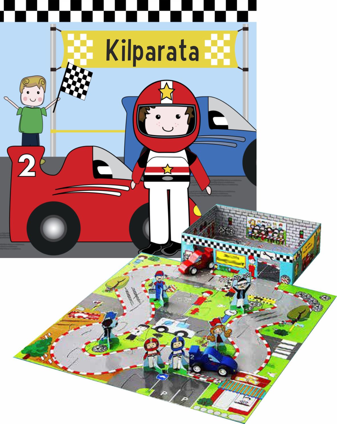 • kaksi puista kilpa-autoa ja kuusi kartonki-ihmistä
